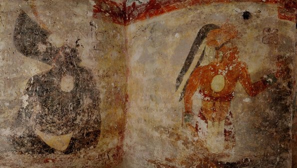 “Nunca tínhamos visto nada igual”, anunciou Stuart. Ele destacou que se tratam das primeiras pinturas mais encontradas alguma vez em paredes. Nestas paredes foi possível observar figuras humanas pintadas e hieróglifos escritos em preto e vermelho em que numa delas exibe a figura do rei com penas azuis e glifos com o significado de “irmão menor”.